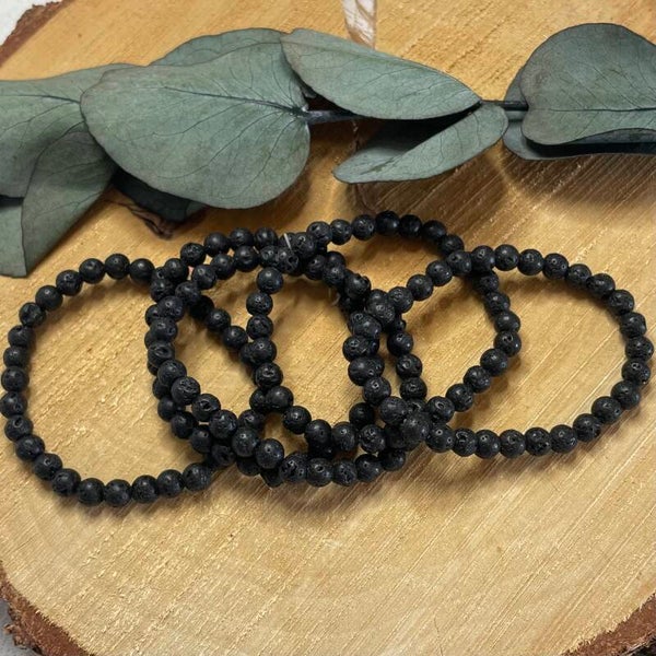Deze lavasteen armband heeft kralen van ca 5 mm en is geregen op elastiek.