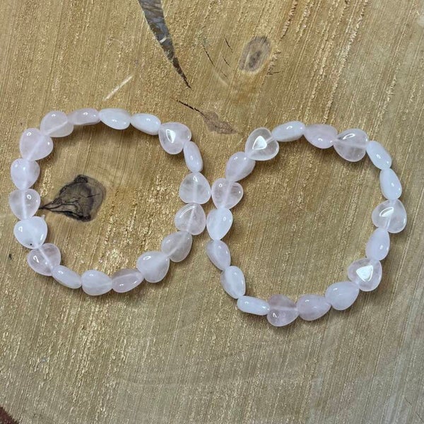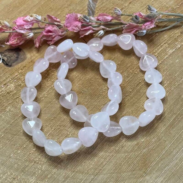 Deze armband heeft rozenkwartskralen in de vorm van hartjes met elastiek.