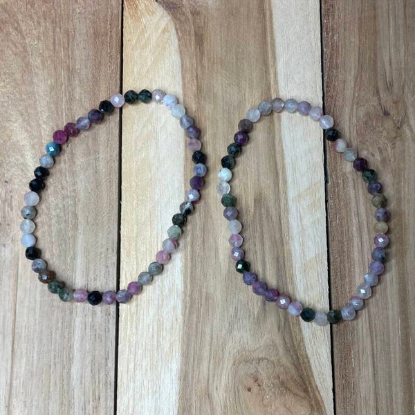 Deze armband van toermalijn facetkralen en elastiek heeft fijne kralen van ca. 4 mm.
