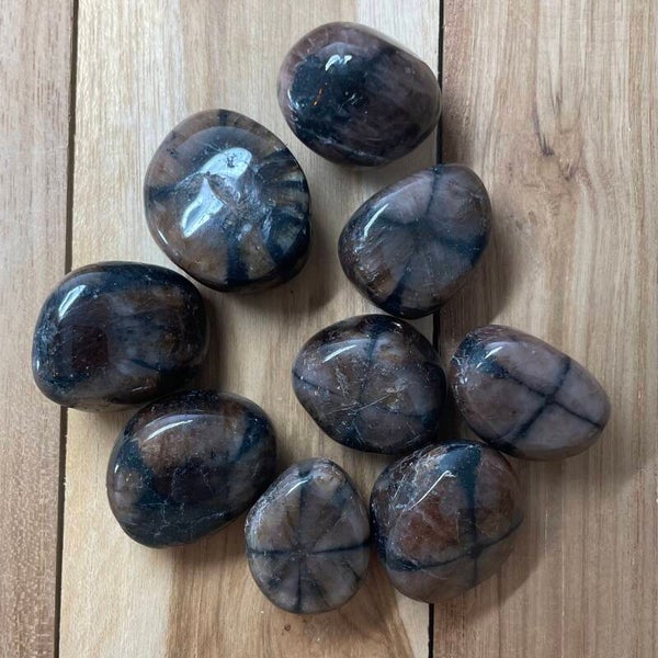 Je ontvangt een van de chiastoliet trommelstenen van de foto's. Chiastoliet wordt ook wel kruissteen genoemd. Kleuren van de foto's kunnen licht afwijken. Elke steen is een uniek natuurproduct.