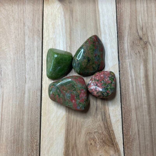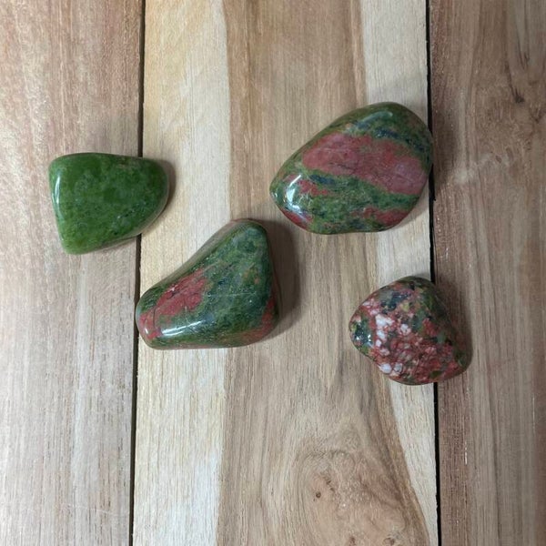Je ontvangt een van de unakiet trommelstenen van de foto's. Kleuren van de foto's kunnen licht afwijken. Elke steen is een uniek natuurproduct.